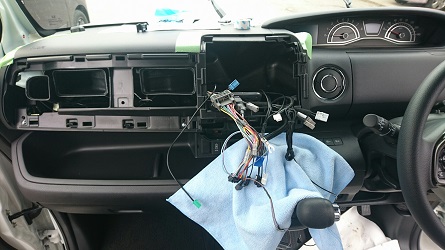 作業日誌 新車N-BOX 室内広々、人気のハイトワゴン『N-BOX』 今回は8インチナビの取付です。 今回は純正7インチ→9インチへのインチアップなのでフェイスパネルごと交換になります。 養生してバラします。横着すると、かえって大変だったり傷ついたりするのでバラせる所はバラします。 作動確認し専用パネルを装着して作業終了。 やはり大型のナビは映えますね! 有難うございました。