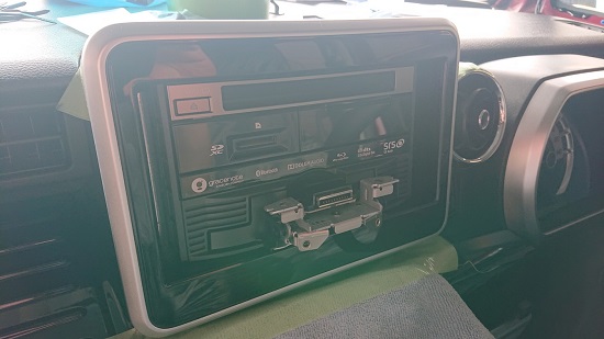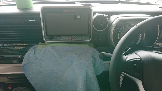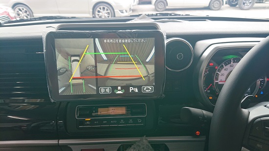 作業日誌 新車スペーシア 予報が外れ雨は降らずに済みましたが蒸し暑いです。 本日はスズキ スペーシアカスタム コーティングしたてでツルツルです。 作業内容はナビ、ドライブレコーダ、ETCの取付け。 今回はパナソニック製の9インチモニター別体型ナビを取付けます。 ドライブレコーダは定番のカロッツェリア製。 車種を選ばず付けやすいです。 メーカーオプションの全方位カメラを社外ナビに対応させるキット。 全方位を映すので映像切替スイッチも付いてます。 全ての配線をナビ裏まで引っ張りキレイに束ねます。 先程の全方位カメラとナビを接続するキット。 映像切替スイッチは運転席ステアリング脇まで伸ばします。 配線を接続し1度モニターを仮止めし作動確認したら本体を固定します。モニターは大きいのでフェイスパネルを先に取付けてから最後に固定します。 ETCはグローブボックスの中に設置。 ドライブレコーダも場所を確認しながら貼り付け。 最後にモニターを取付けて作業完了です。このナビは車種を選ばずに大画面を楽しめるのが良いですね。 全方位カメラもしっかり映ってます。