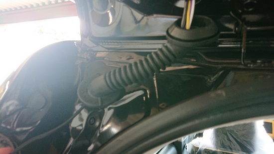 カメラ配線をバックドア内から蛇腹ホースを経由して室内に通します。