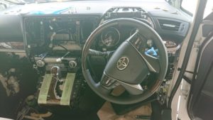 作業日誌 新車アルファード 間もなく8月も終わりですが、まだまだ暑い日が続いてますね。 さて本日はトヨタ アルファードです。 車内は既にサウナ状態。 汚れが目立ちそうなベージュの内装。 これは気を使います。 と言う訳で車内は後回し(笑) バックカメラから取付けます。 内張りとガーニッシュを外しカメラ本体の取付。 純正カプラーを使用するので配線は楽々です。 ガーニッシュを戻して終了。 いよいよ車内に。気合い入れます。 フリップダウンモニターの取付。 今回はカロッツェリア製の11.6インチです。 位置を確認し天井を切り取ります。 アルパイン製に比べると開ける穴も小さく作業しやすい気がします。 フロントのルームランプを外しランプの電源をとります。 残りの電源等の配線は天井からピラーを通してナビ裏にまわし、ひとまず終了。 ナビとETCを取付けます。 オーディオ廻り・メーター廻り・グローブボックス・キックパネル全てバラします。 ETCは純正位置に。 社外なので左右に隙間が空く為、スポンジテープで埋めます。 取付け完了。 今回はケンウッド製の9インチを取付けました。 フリップダウンも取付け完了。 ルームランプもイルミネーションもバッチリです。 ステアリングスイッチやバックカメラ等の各種設定をして作業終了です。